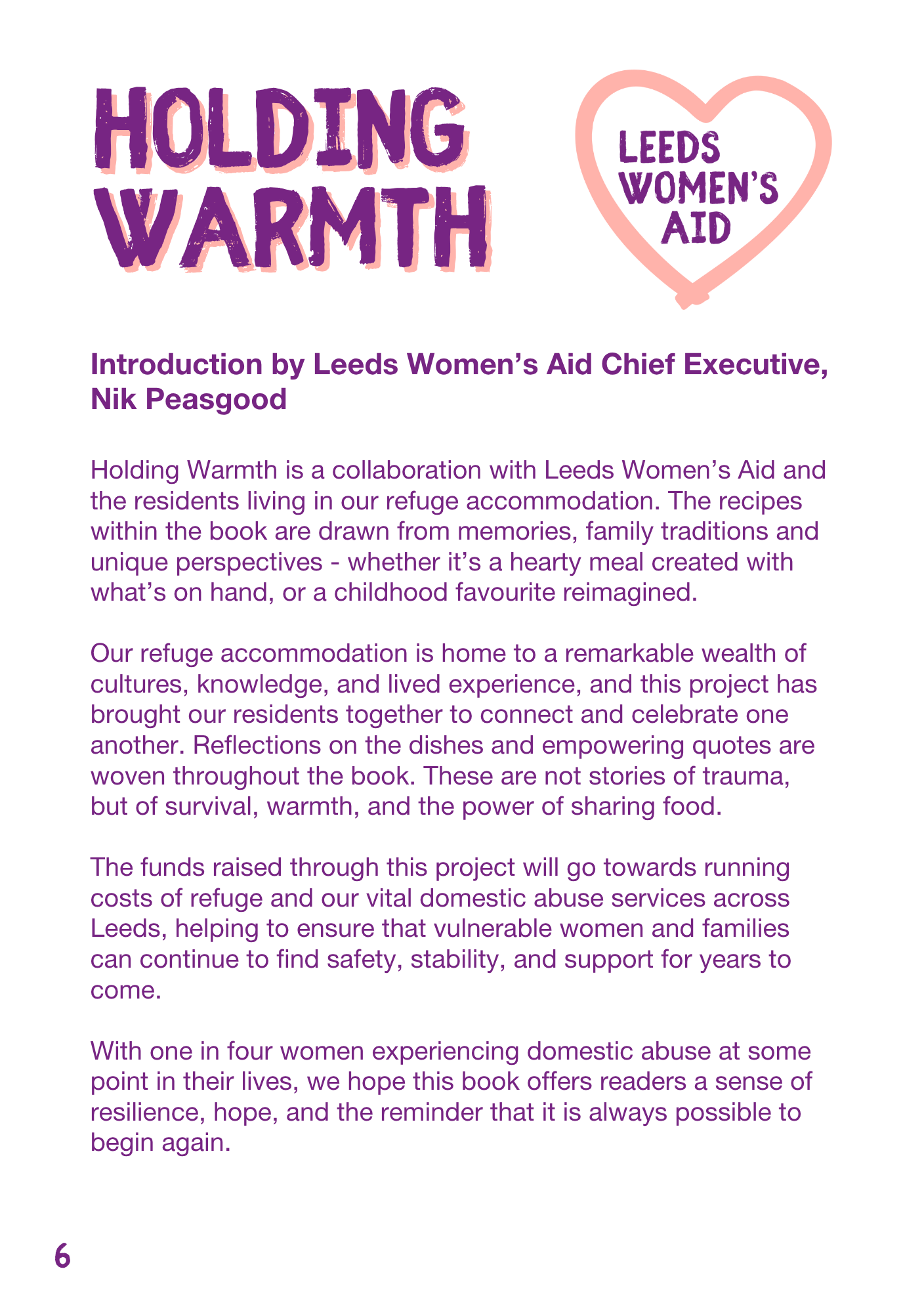 We suggest a £10 donation per copy of Holding Warmth. All funds raised will go towards our refuge running costs and vital domestic abuse support services across Leeds.